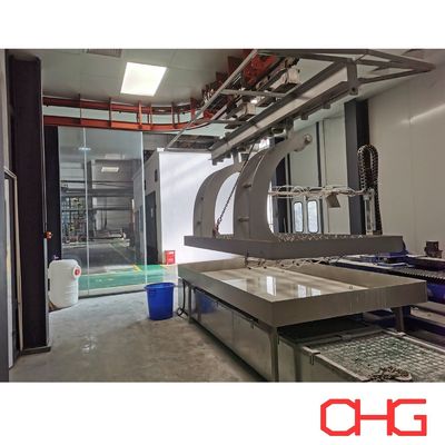 The line incorporates a dual-mode spraying setup to ensure complete surface coverage and consistent film thickness:
