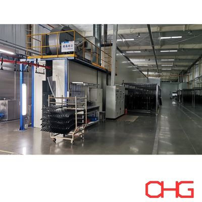 This powder coating system is purpose-built for automotive components, offering stable performance, high efficiency, and consistent coating quality. The line integrates multiple functional sections, including elevator-assisted loading, multi-stage pretreatment (pre-degreasing, degreasing, rinsing, conversion treatment, and air blowing), drying, cooling, powder application under controlled temperature and humidity conditions, curing, forced cooling, and manual unloading.